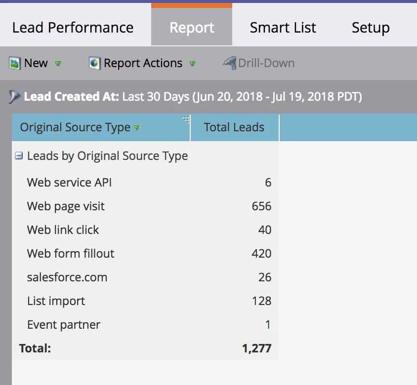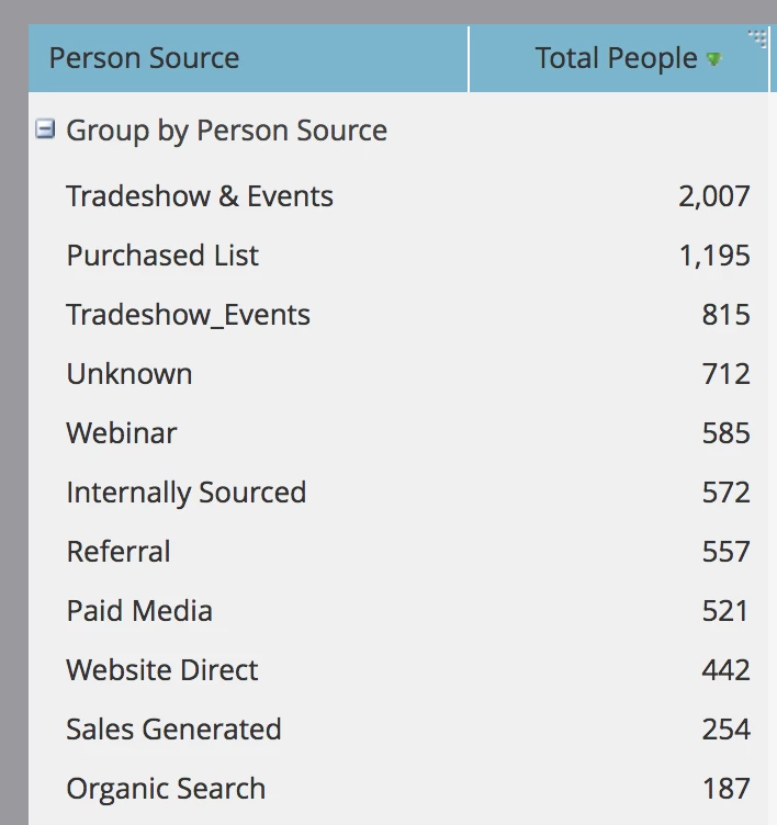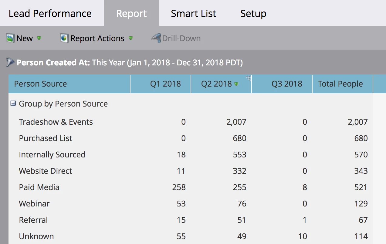 I use a combination of activity dates and grouping to create many different permutations of this report. This is predicated on the fact that you have person source assignment set up. If you haven’t you can group people using Marketo system fields such as original source type where the data is automatically being set by Marketo.