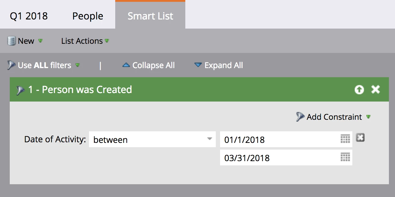 First, create smart lists in the lead database for each desired column. For example, the Q1 2018 smart list uses the filter a person created between Jan 1, 2018, and March 31, 2018, and so on.