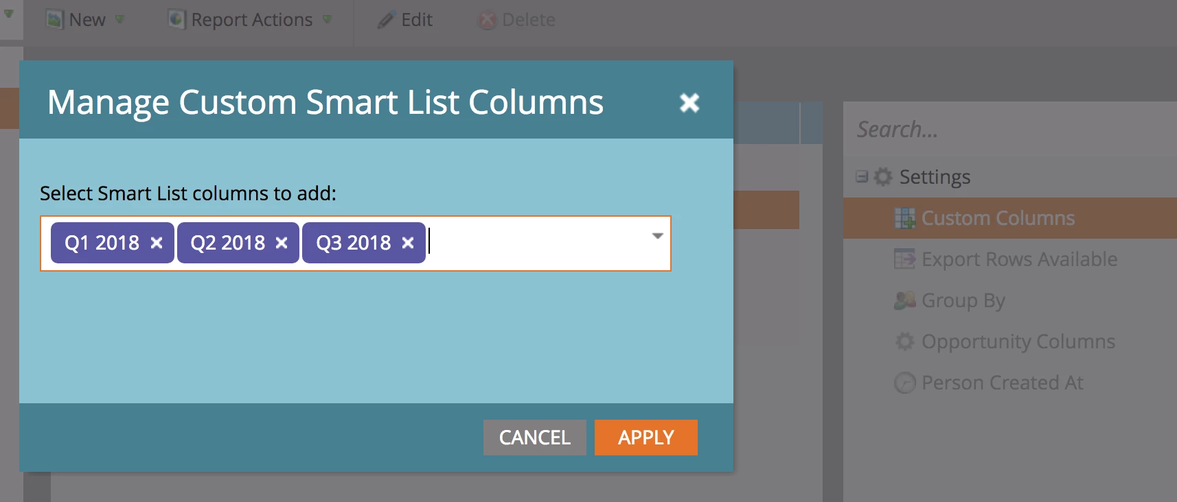 What if we wanted to know how the numbers breakdown by quarter? We can add custom columns to this report. These custom columns are driven by smart lists.