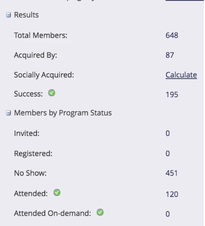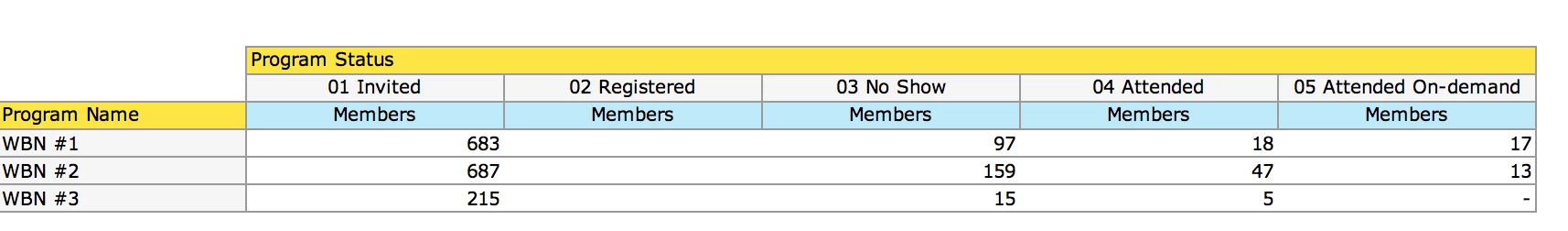 Alternatively, if you have Advance Report Builder, you can get this type of information and much more with the different report types and pivot table capabilities. In this reporting example, several webinars can be compared side by side broken down by the different channel statuses.