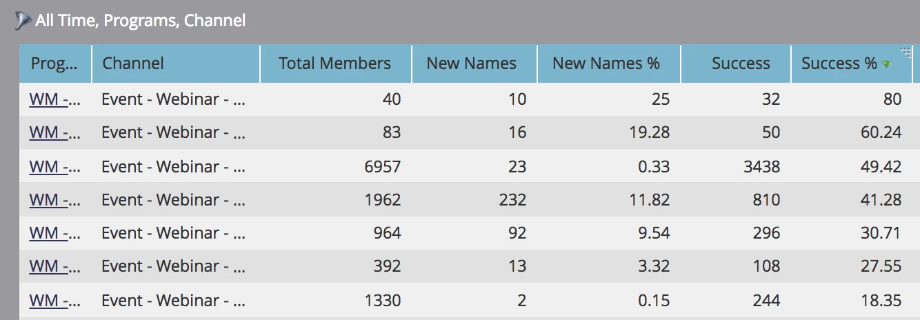 If I look at the webinar vs. online advertising channel, you’ll notice that the number of success (total) is significantly different. The number of members reaching success (i.e. attended a webinar for the webinar channel or converted by filling out a form from a paid PPC or social media campaign for the online advertising channel) is a magnitude of three-fold difference.