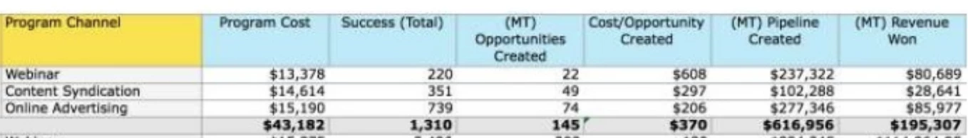 If I just looked at the cost of reaching success, I might draw the conclusion that online advertising is the way to go. But wait, I shouldn’t stop there. If I look at the MT revenue won, you’ll notice that the amount is quite similar. Therefore, the webinar and content syndication channels are performing similarly when it comes to how much closed-won revenue was influenced by each channel. It appears that the people who are attending the webinar are the right people to be talking to and it takes more volume of people flowing through the online advertising channel where they are downloading infographics and white paper to achieve similar results revenue-wise.