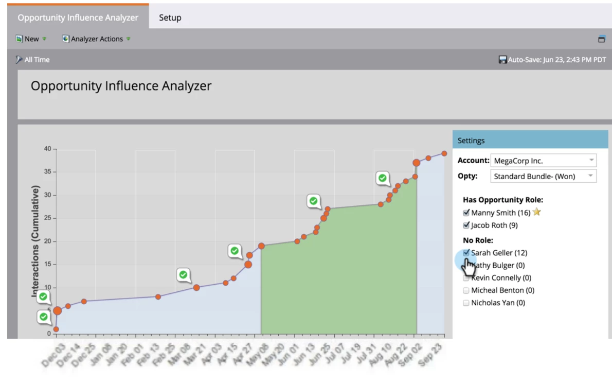 This is really one of my favorite reports that I think is underutilized. There are two scenarios where I use this report. The first one is after a deal closes, I want to do a bit of forensic work and look back on what marketing engagements and activities contributed to and influenced that deal. If something went really well, what can I do to repeat that? In this report, you are looking at one opportunity at an account. The orange dots indicate when a contact from this particular account “MegaCorp” became a member of a program. The green checkmark indicates when someone hit a program success. It’s less about looking at the number of cumulative interactions denoted by the y-axis and more about what types of engagement activities are happening over time.