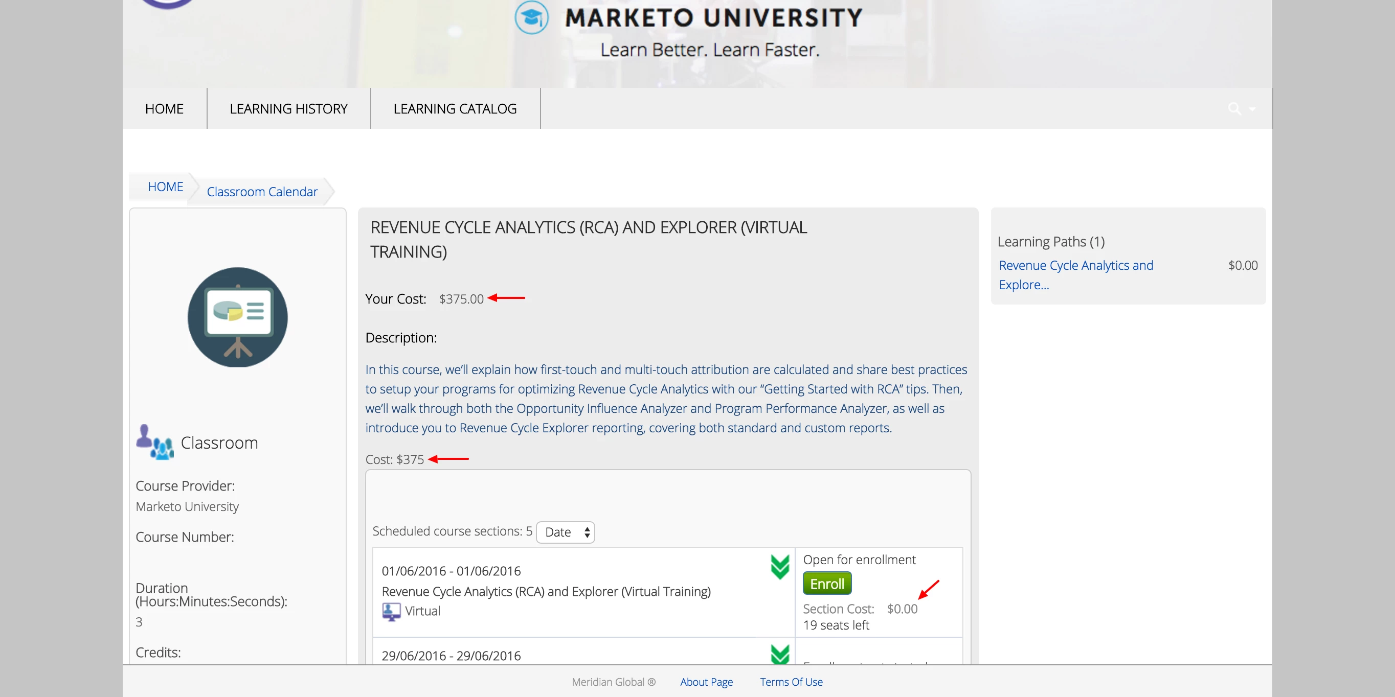 I'm currently subscribed to the Marketo learning portal (http://learn.marketo.com), but it's confusing when signing up to Virtual events, in the description, it has a cost, but beside theI Enroll button it says $0.00, which is correct? I can't seem to find any subscription information in my profile or any information on how it works. When I click the button, it doesn't prompt me to pay but the subscription was purchased by my organisation so don't want them auto billed without informing them. If $0.00 is correct, does that mean all training is included in my subscription or is there still pay as go elements too?