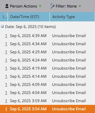 We’ve seen a sharp spike in unsubscribe rates in recent months. Unsubscribe logs show users being marked as unsubscribed across multiple emails (see image), with entries spaced just 5 minutes apart—this does not reflect actual user behavior.
