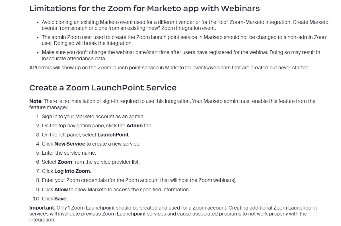 Based on the Zoom documentation, it mentioned this step (adding the native Zoom Launch Point service) is still needed AFTER the Marketo App has been added from the Zoom Marketplace. Can you confirm if this is the correct process?