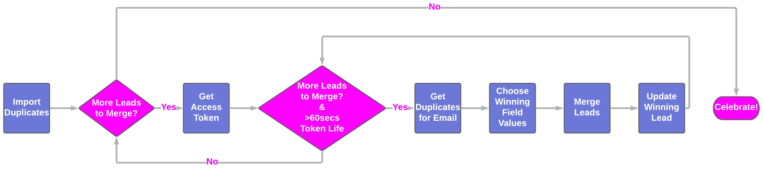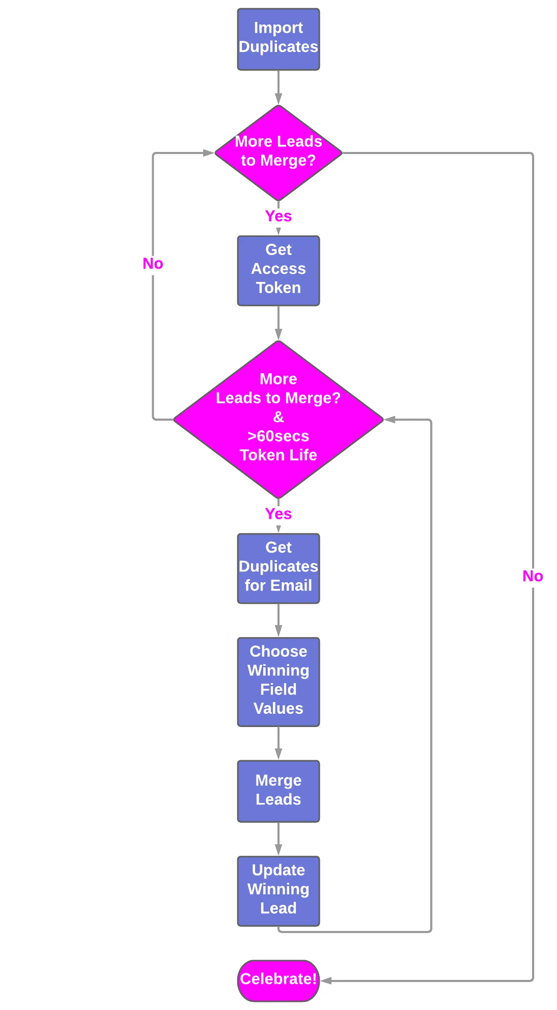 Once the data has been extracted from Marketo it can then be imported into the main script as a dictionary using the Pandas library in Python. Before looping through this dictionary of duplicates, it is necessary to get an access token and ensure that there are more than 60secs left on the token life so that there is enough time to complete the merge and update the winning person in a single iteration of the loop. This is achieved using nested while loops with the inner while loop checking that token life is greater than 60 secs before every run and if this is not true the outer while loop will wait until the access token has expired and then get a new access token with 3600secs of life.