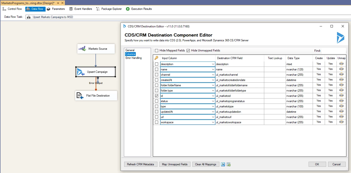 Hi - You can create an SSIS job to integrate Marketo Programs with Dynamics Campaigns. See below for the upsert job I created. We use Kingswaysoft SSIS. The integration works very well. Hope this helps.