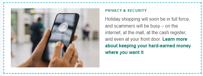 <a data-name="Learn more about keeping your hard-earned money where you want it" data-type="url" href="#" style="font-weight: normal;color: #007769;text-decoration: none;text-transform: normal;" title="Holiday Scams blog"><strong>Learn more about keeping your hard-earned money where <em>you</em> want it</strong></a>