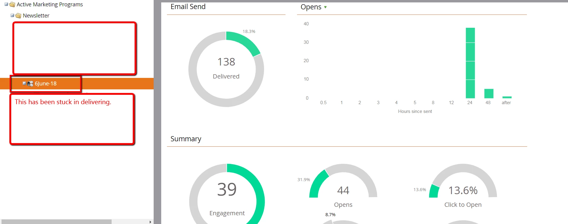 I'm sorry if this might have been discussed in another thread, but I couldn't find it if so. I'm a beginner Marketo user. I sent a newsletter out on June 4, and it still shows that it's "delivering". These are customers of ours and I've sent this newsletter to the same audience with no issue before, but this time, hardly any were delivered and the program is stuck. Any suggestions on what went wrong or how to fix? Thanks much if you have ideas or feedback!