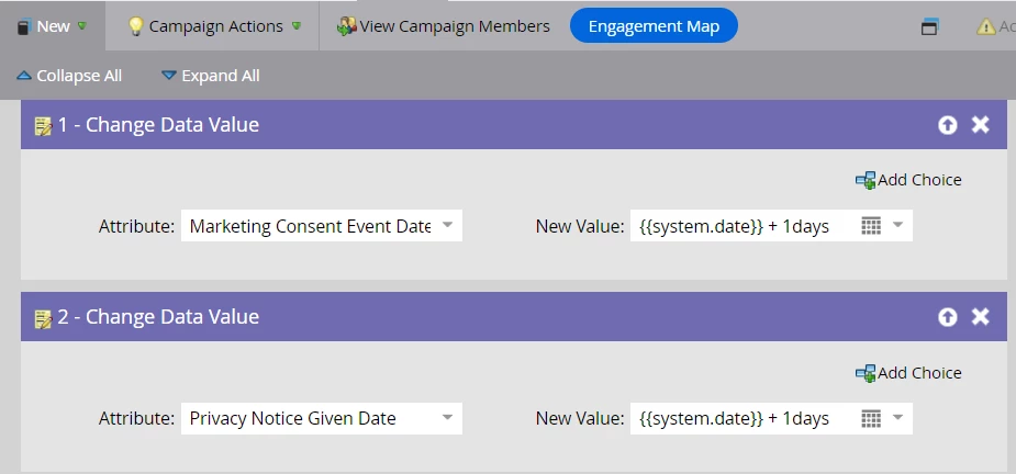 Problem: There is one trigger campaign created at the operational level which triggers when the Privacy Notice value gets updated and it changes the Privacy Notice date to be {{system.date}}. However, I created my trigger campaign (which includes the triggers for Marketing Consent, Marketing Consent Event date, Privacy Notice, Privacy Notice Given date triggers and filters) and set the priority as "High" so that I can override the already created trigger, and set the dates to be {{system.date}} + 1days in the flow step as can be seen in the snapshot below: