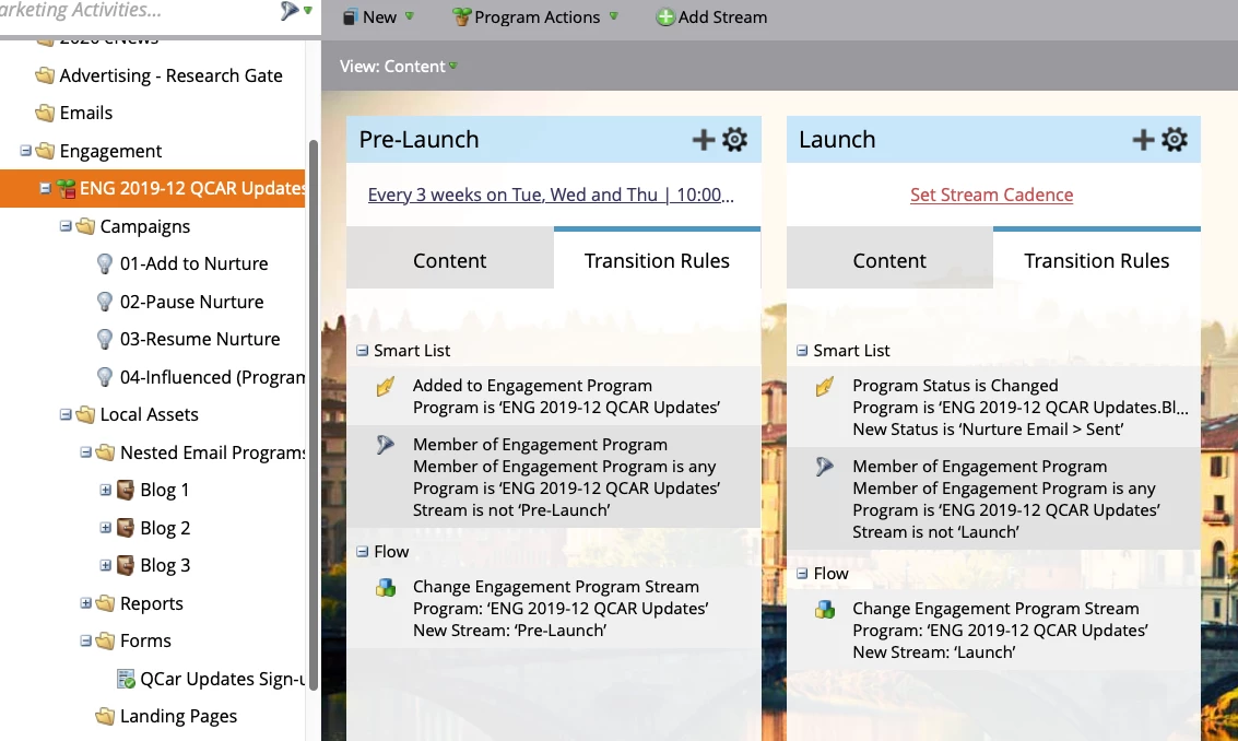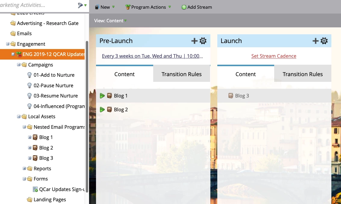 We'd like to send out a series of blogs, where the member will receive the next blog regardless of interaction. We only have two of the blogs written so far, so I've put those in an initial "Pre-Launch" stream. When the third blog is ready I'd like to activate the program in the second stream called "Launch."