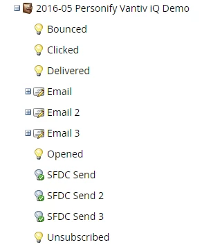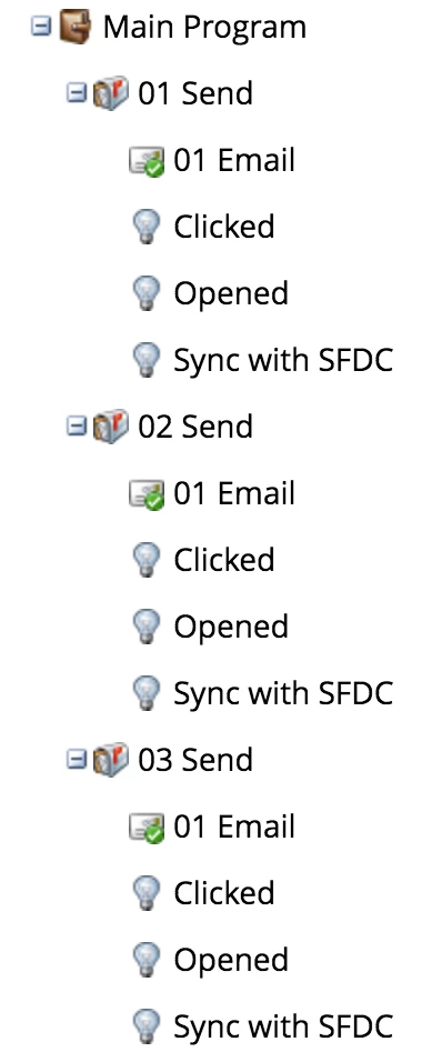On the first campaign (what we use today) you will see smart campaigns that just change a program status on a Marketo level (no sync). Underneath is the idea I am potenially implementing.