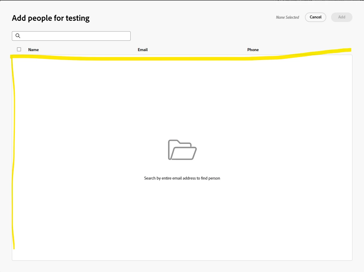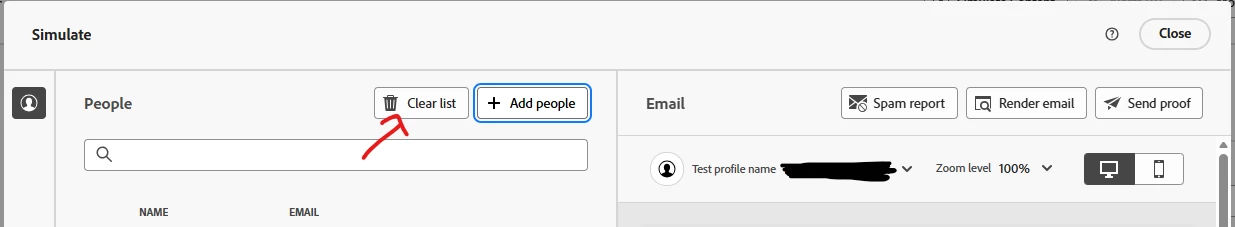 When simulating an email in Marketo and trying to add people as recipients, the list of available people is empty. Users can only add recipients if they already know the exact email address and search for it explicitly.