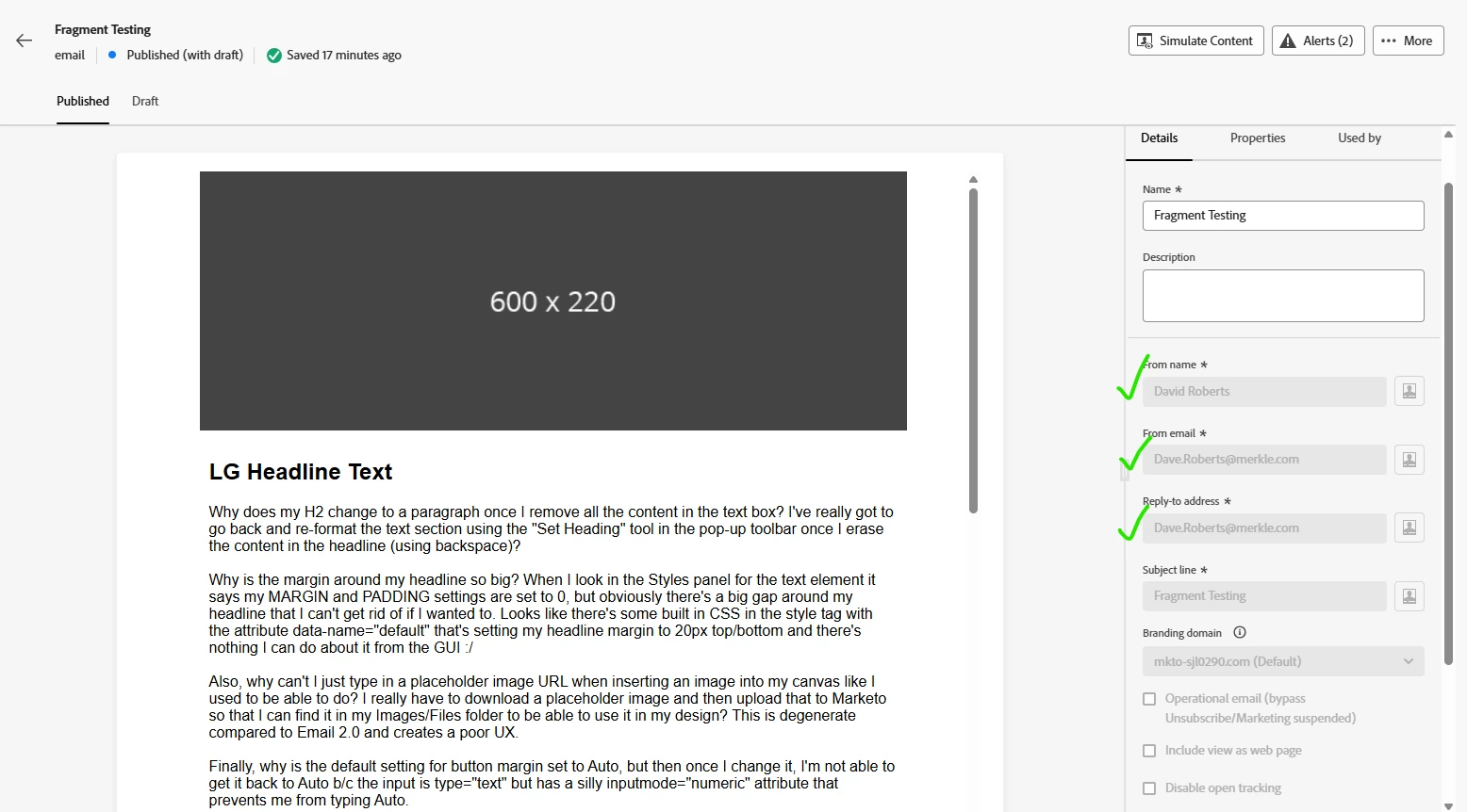 I seem to have consistent issues with the new editor, including when I did get tests, the emails did not look at all like what we created.