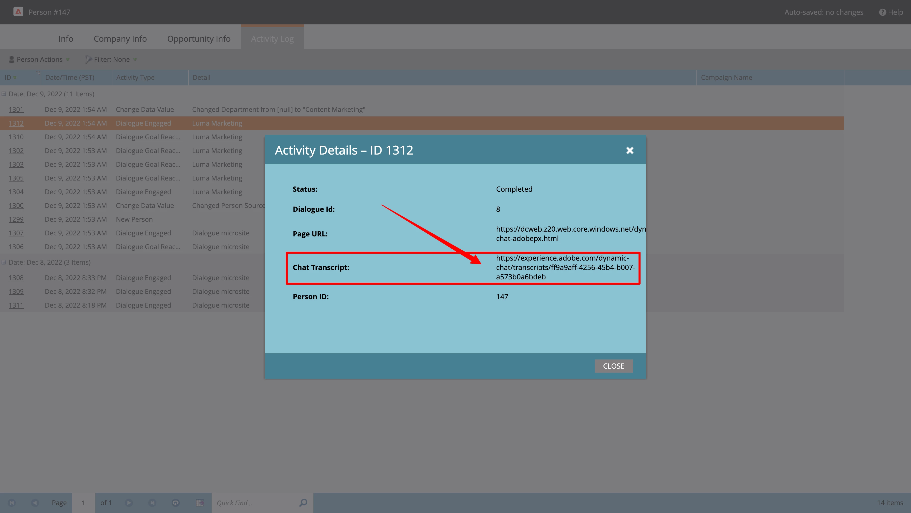 As you may already know, all lead engagement with the chatbot is captured as an activity against the lead in Marketo Engage. Now you can see how the conversation went with the chatbot transcript. A new attribute "Chat Transcript" is added "Engaged with Dialogue" activity type which captures the URL of the conversation transcript.