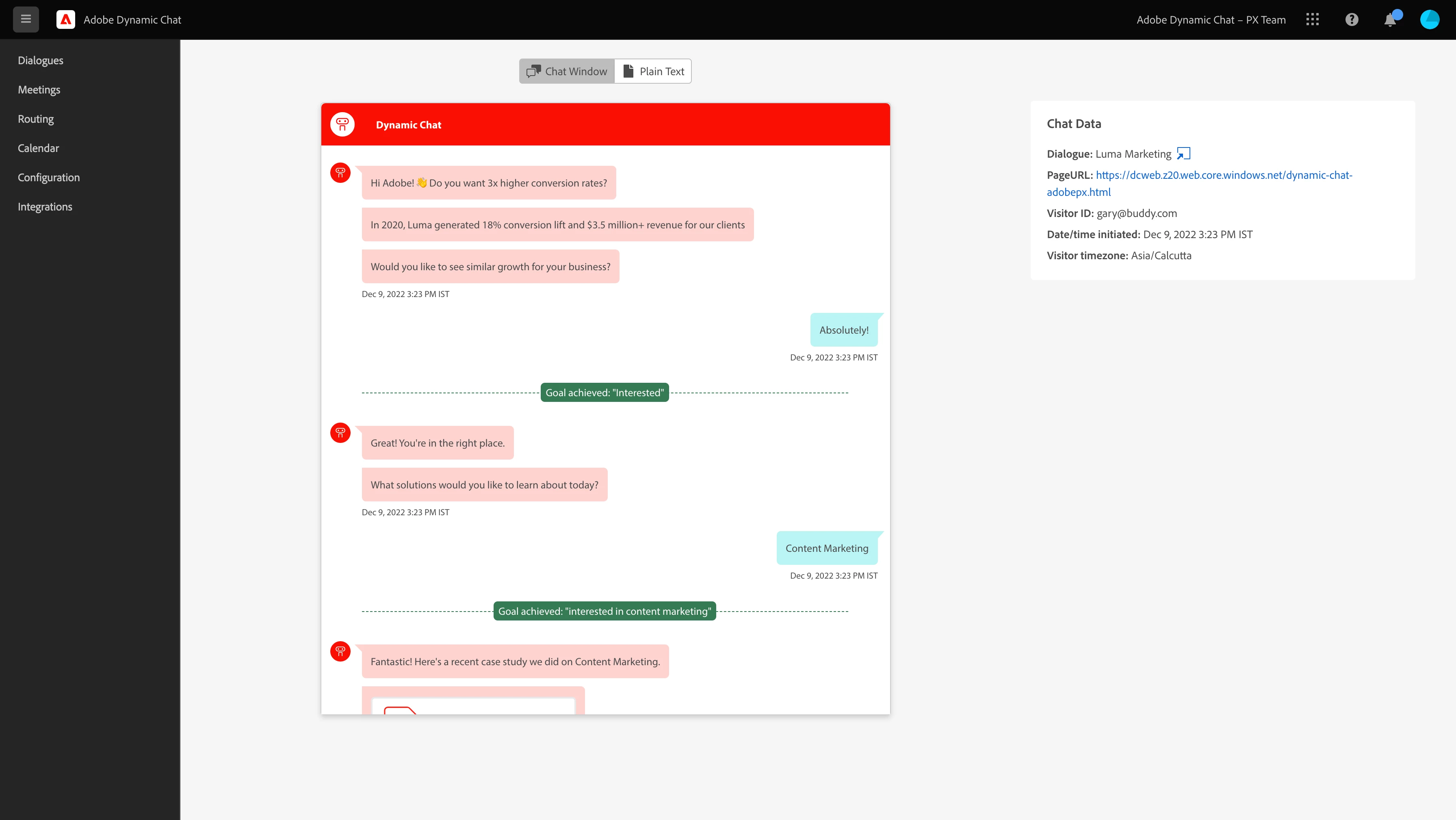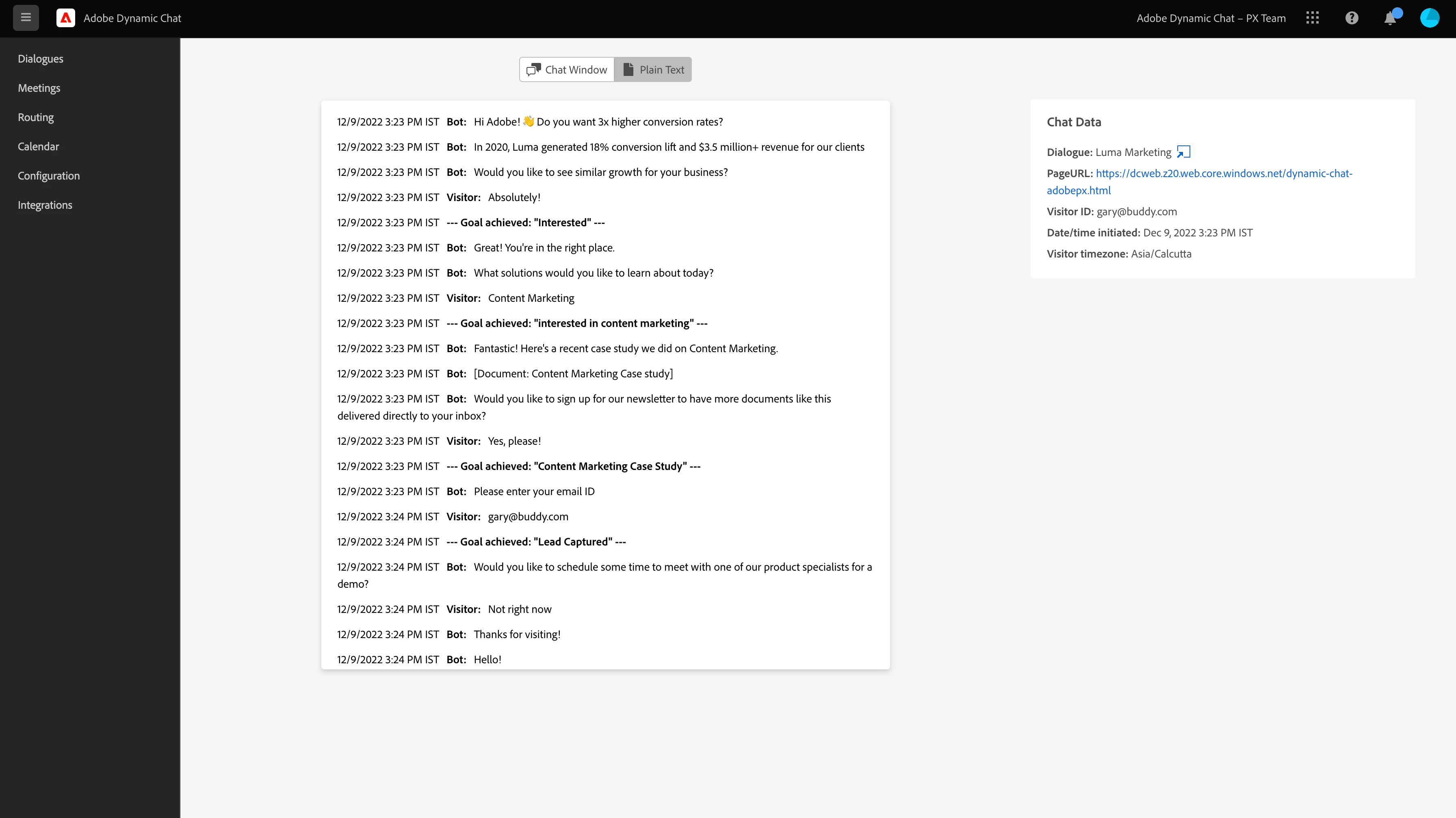 You can view the conversations either in the chatbot window or in plain text format, along with dialogue and time details on the right.