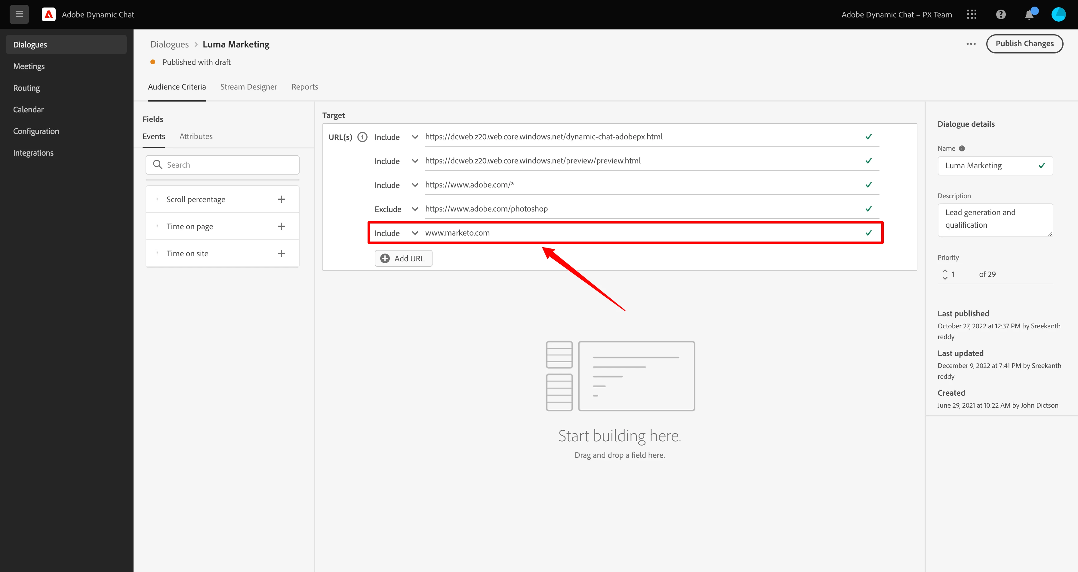 We have made the following updates to target URL in audience criteria tab of a dialogue: