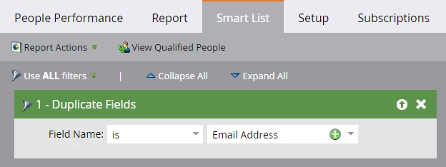 1. Add the filter "Duplicate Field" is "Email Address" to the Report's Smart List.