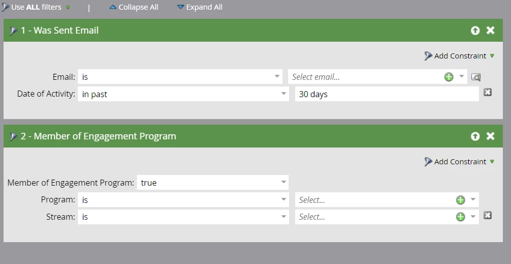 1. What are all the triggers and/or filters I will need to make sure everyone moves through each stream and receives all 5 emails (no matter if they opened/clicked, didn't open/click, exhausted, etc)? Instead of using the transition rules on the streams, I plan to set up Smart Lists in a separate folder contained within the program.