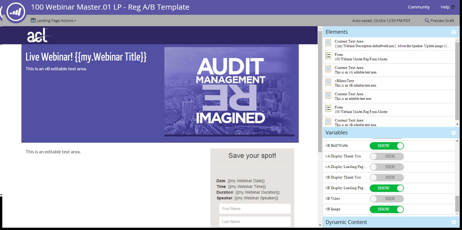 This approach is made more viable with the new guided landing page templates, which add an awesome new functionality called Variables. These, plus some creative applications of program/folder {{my.Tokens}}, allow you to build a template that works for nearly any situation. Here are a few ideas to try:
