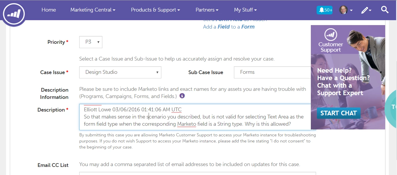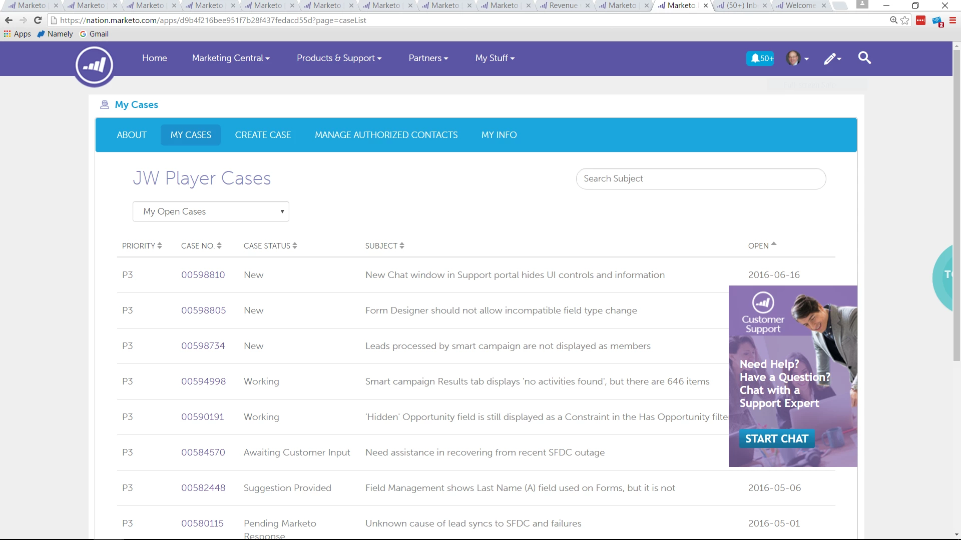 A new chat pop-up is being displayed in the support portal, but it hides information and controls. Unless my browser window is expanded to at least 1540 pixels wide, it covers fields and controls when I am creating and reviewing cases. Even when the browser window is a full 1920 pixels wide, the chat pop-up hides the View Case Details button after creating a new case and hides the case open dates in the list of cases (see screen shots). This is very annoying. Please provide an option to close the chat pop-up.