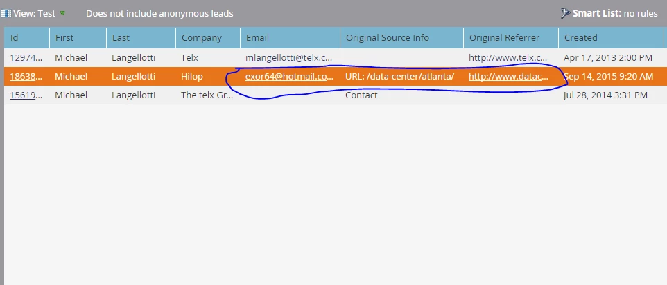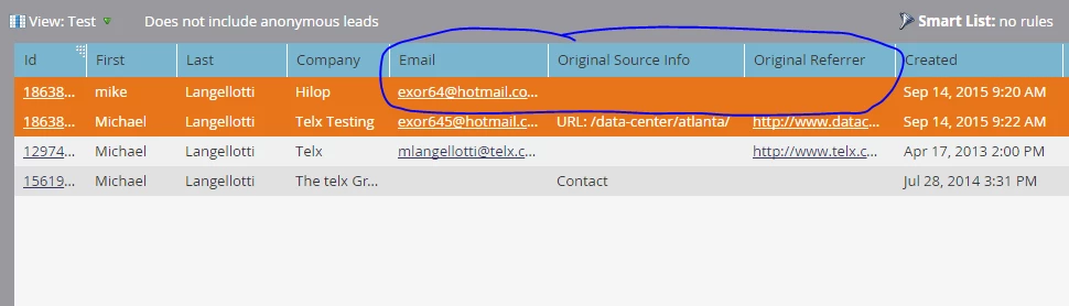 2. Original referrer is not necessarily set upon the record's creation, but one the record first encounters the Munchkin API. If the record already exists in the database and the original referrer value = NULL, then the value will get overwritten. As a result, you end up getting instances where maybe you have your unsubscribe page shows up as the original referrer. Screenshot below.