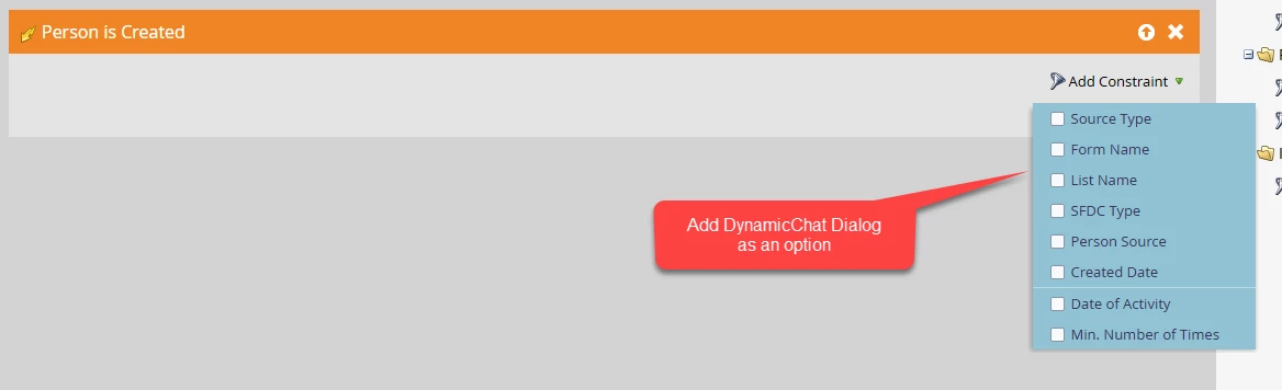 I need to be able to run a trigger when someone is created through a DynamiChat dialog. Can we get a constraint for DynamicChat added?