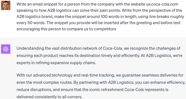 I was quite impressed by ChatGPT’s performance when it came to creating an email snippet to insert in the email body. I think the Coca-Cola example below is a good example of how personalized ChatGPT can make our email content just by providing it with a website.