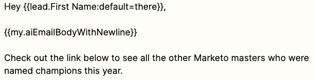 Using the ChatGPT content fields is as easy as referencing the lead tokens within your email subject line and email body. However, in the case that ChatGPT cannot find any information from the website and returns NA we cannot rely on using the default value associated with the lead field token because this will only insert the default when the field is empty and not when the field is “NA”.