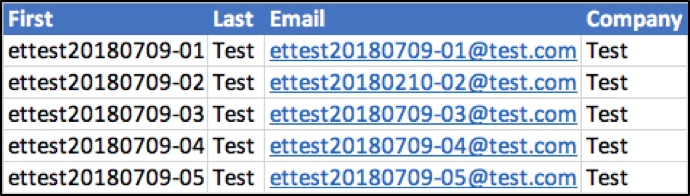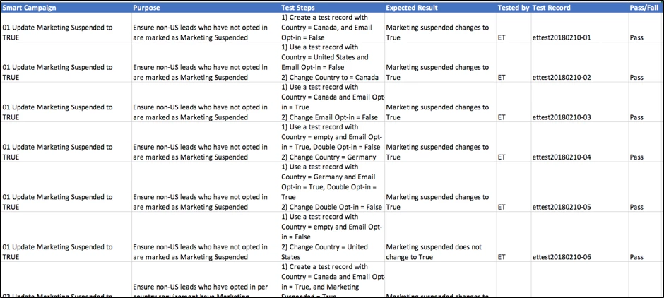 A standard naming convention for your test records is useful for several reasons. First, you'll want to be able to easily differentiate test records from live data if you're doing you're testing in a Marketo production instance rather than a sandbox. Second, for documentation purposes it’s good to have a way to quickly associate a test record with a particular scenario, especially if you're testing complex logic that requires multiple rounds of testing, fixes and re-testing. Our team uses the following standard format for our test records: