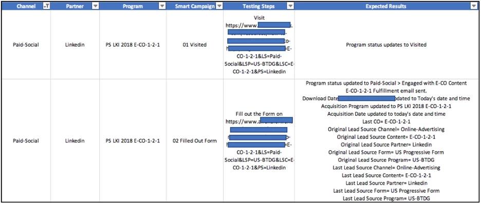 It’s likely that your team is leveraging Marketo Programs, channels and triggered Smart Campaigns in some capacity to capture content interactions across various engagement channels. A common approach to this also involves a URL querystring strategy so that a single landing page can be promoted across channels. Anytime you build a new tracking program it’s best to visit the corresponding URL with querystring, submit the form, and ensure the correct Smart Campaigns are triggering, and appropriate actions are then taken to the newly created record (depending on your architecture this may be data value updates, a confirmation email, and/or a Marketo Program status update).