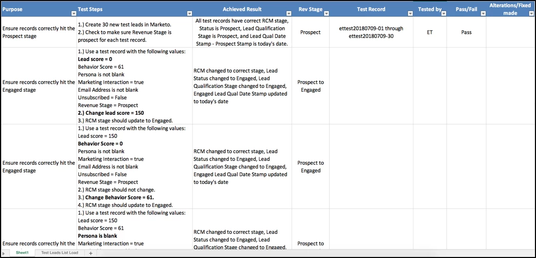Before you build your RCM, it’s a good practice (and not just for testing purposes) to document the criteria a record must possess to move into each stage – scoring thresholds and any field attributes. When you're creating your RCM test scenarios you can use this as a guideline. You should test every trigger and flow step within each Smart Campaign that is leveraged in your RCM logic. Consider any skip or turn-back logic you have incorporated, where a person can move from one stage to a non-subsequent stage. If your RCM listens for contacts to be added to opportunity records in your CRM, then you'll want to simulate this behavior within your CRM (if you're testing an RCM in a Marketo production instance, be aware of implications this will have in your CRM production instance). Testing an RCM is often more time-consuming than building it.