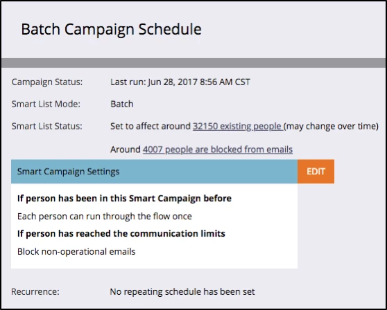 Run a test record through each Smart Campaign used within your Marketo Program. Ensure Marketo Program Status updates, wait steps and re-sends are all happening as intended. If you're using filter logic, run some checks to ensure there are no errors here. Before you schedule your batch campaign make sure that the number of people expected to run through the Smart Campaign is in line with what you'd expect, and ensure your Smart Campaign settings are correct.