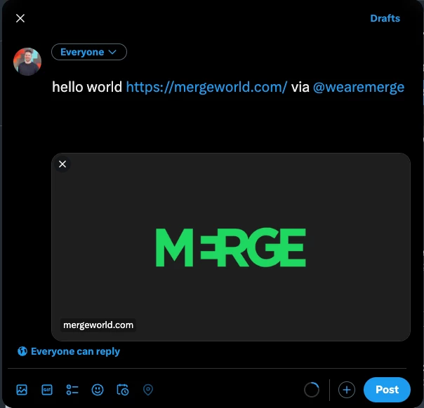 It can be formatted as such: https://twitter.com/intent/tweet?text=hello%20world&url=https://mergeworld.com/&via=wearemerge