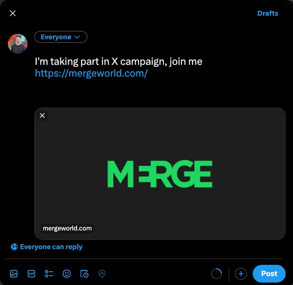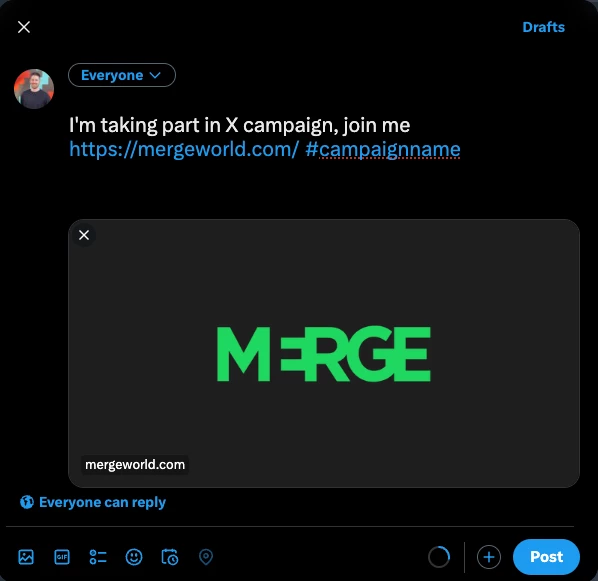 https://twitter.com/intent/tweet?text=I'm%20taking%20part%20in%20X%20campaign,%20join%20me&url=https://mergeworld.com/&hashtags=campaignname