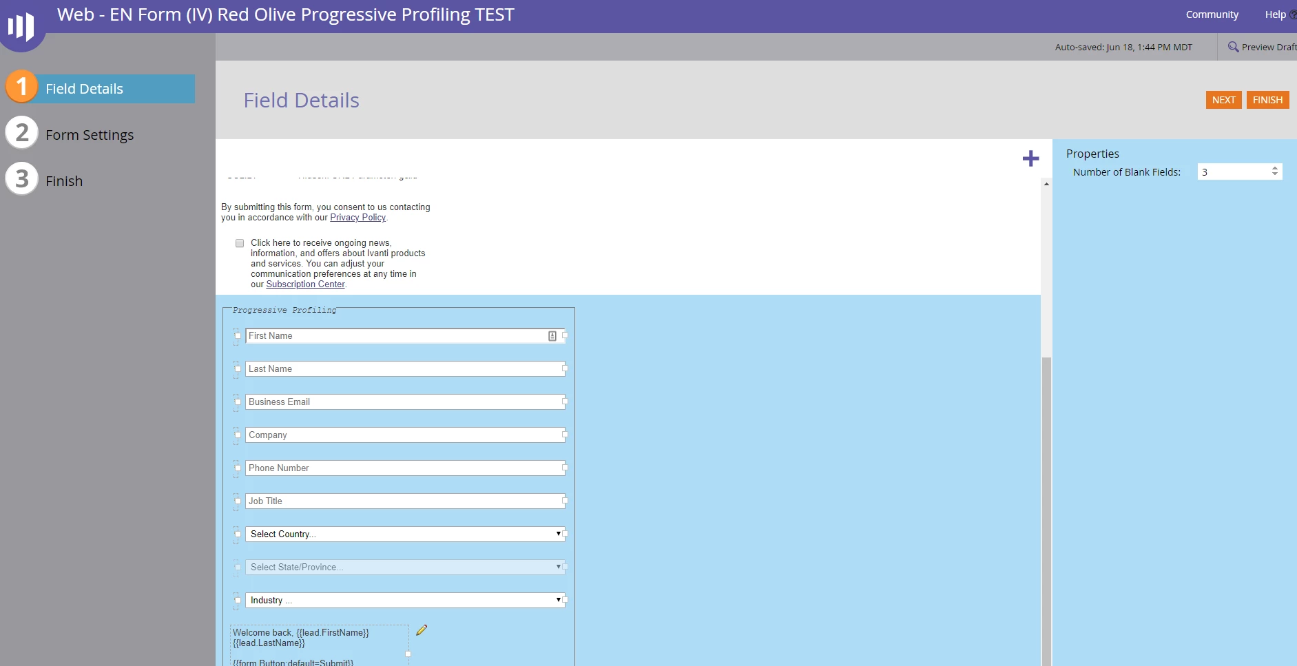 I've set up a fairly standard form in Marketo with Progressive Profiling enabled. There are 9 fields inside the Progressive Profiling area and the Number of Blank Fields is set to 3 (see attached). However, every time I go to the page to test the form, the same 3 fields are there every time. Any suggestions?