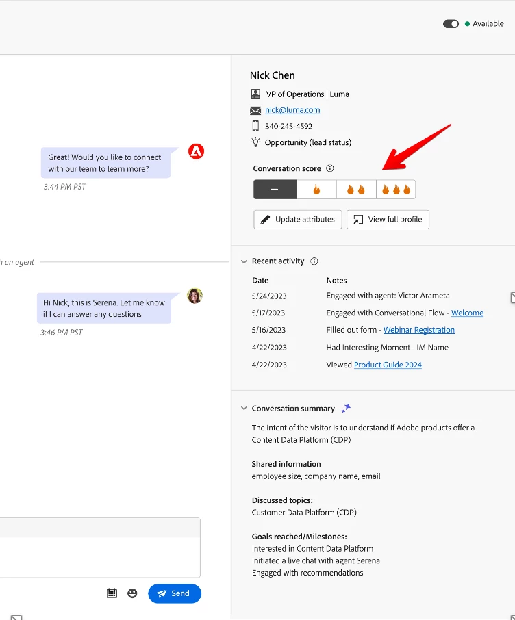 - Update Lead or attributes - Enable live chat agents to update lead or company attribute values based on the conversations