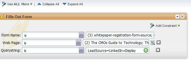 I have our Marketo instance set up to add leads to programs if they fill out forms on certain landing pages and I use the Querystring constraint, i.e. "Querystring is LeadSource=LinkedIn+Display"