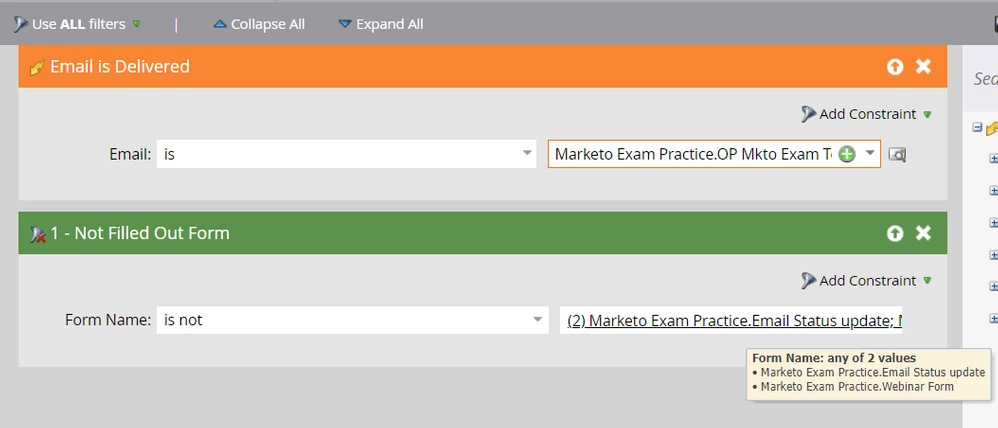 I will not post the actual questions from the practice test, but similar ones that I've recreated in Marketo.