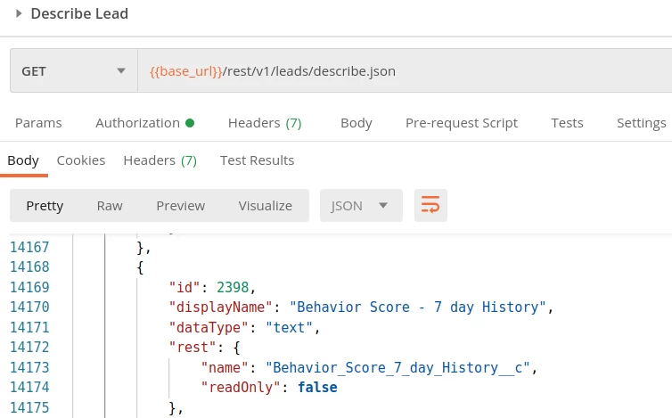 To find the field id for the "Behavior Score - 7 Day History" field, which we will need when creating the job, we need to make a GET request to the Describe Lead endpoint and search the response returned to Postman.