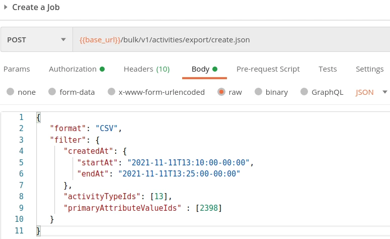 When creating a bulk activity extract job using the Create Job endpoint, the body of the request needs to contain the starting time point and ending time point for the time window you are interested in (the maximum span is 31 days, see the "Bulk API Limits" section below) along with the activity ids that you are interested in and if applicable you can filter even further by specifying field ids.