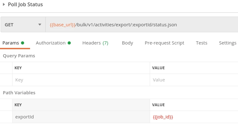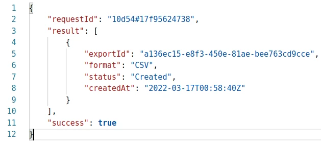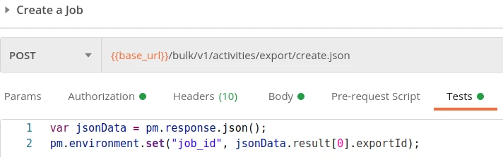 The response to this "create job" request then contains the job id in the "exportId" field. Since we will be using this job id in all subsequent bulk extract API requests we can create a new "job_id" variable in our Postman environment and automatically populate this variable by placing the code below in the "Tests" tab of the request.