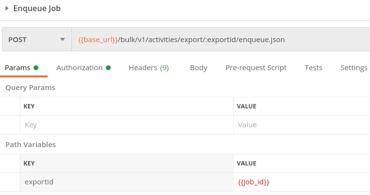 Once the job has been created the next step is to put the job in the queue (see job and queue limits in the "Bulk API Limits" section below) using the Enqueue Job endpoint, which uses the job_id environment variable we populated using the test code above.