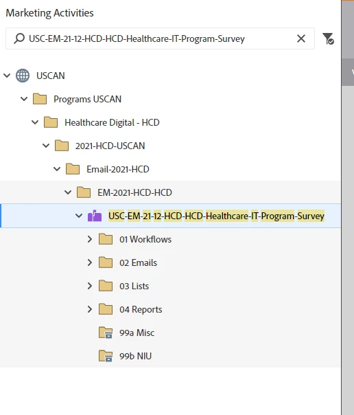 - 99b NIU folder (archived) – houses any workflows, emails, lists, reports, etc. that are not-in-use any longer.
