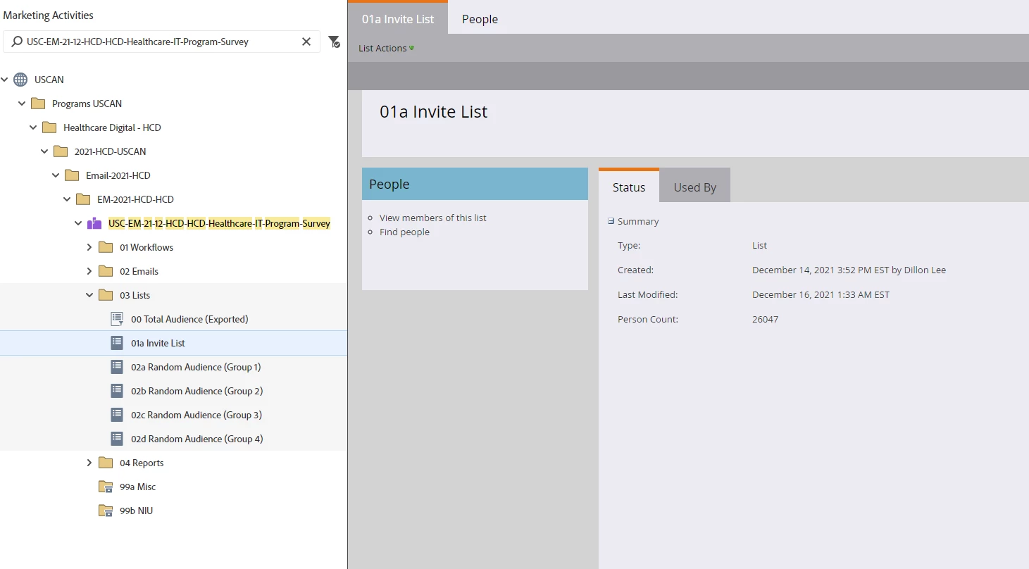 - This can depend on how big your list is – (e.g., Total Audience = 28,000 will break list into four groups listed from 02a Random Audience (Group 1) all the way to 02d Random Audience (Group 2)).