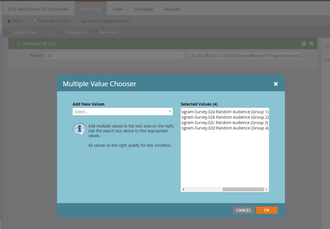 - 01a Invite List – this will be where you import the CSV mentioned above and this will be used in the smart campaign 01a Populate Random Audience (10,000+)’s smart list tab to then break out our random audience groups within this smart campaign’s flow tab