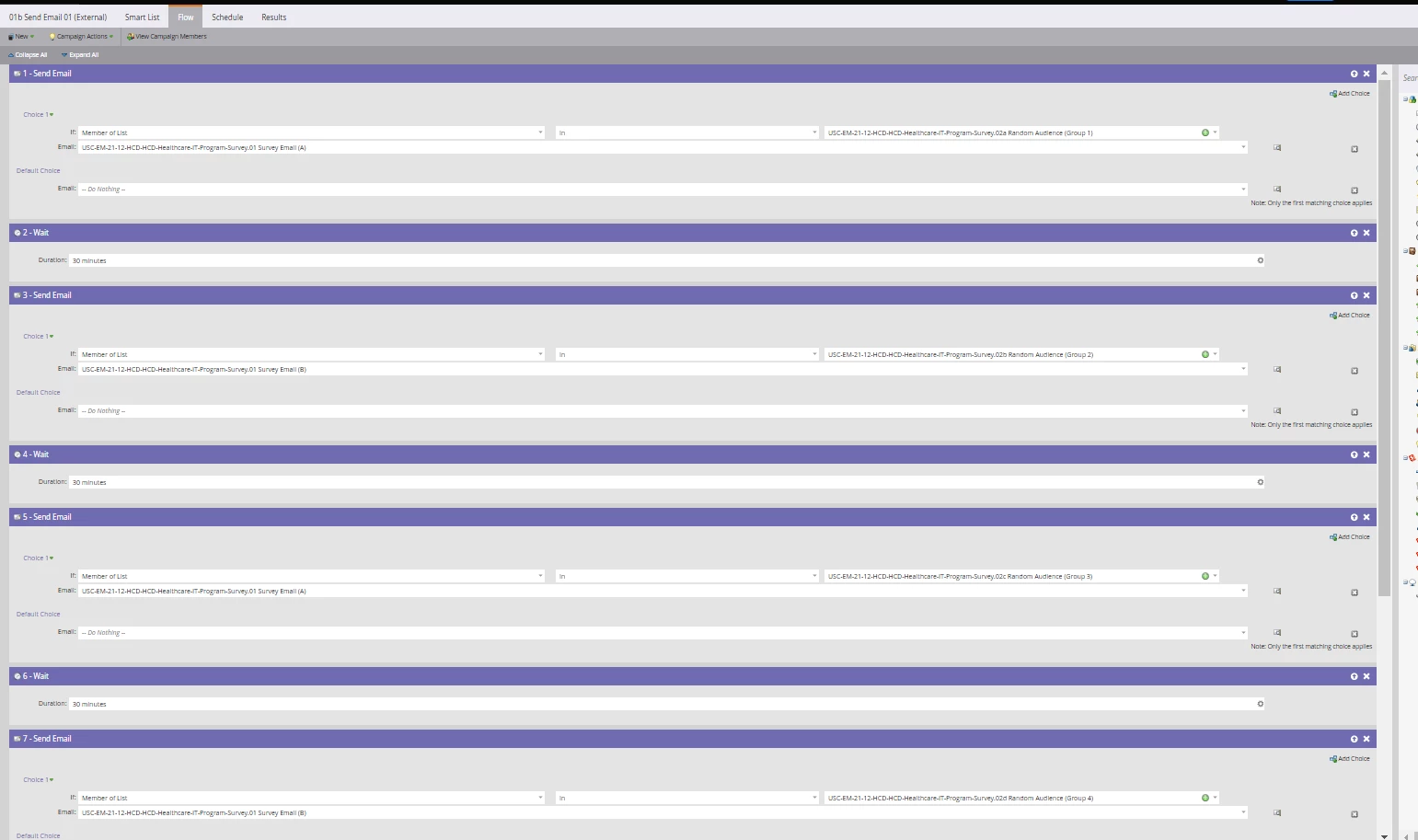 - This is important to have these in Even Groups as mentioned earlier because if we plan to do A/B Testing (2 variables being tested) we need to have an even split, or a total group number that is divisible by 2 (e.g., 4 total groups = 2 groups get Test A, and 2 groups get Test B) and these will each have Wait steps of 30 mins in-between one another under the 01b Send Email 01 (External) workflow, found in this smart campaign’s flow step