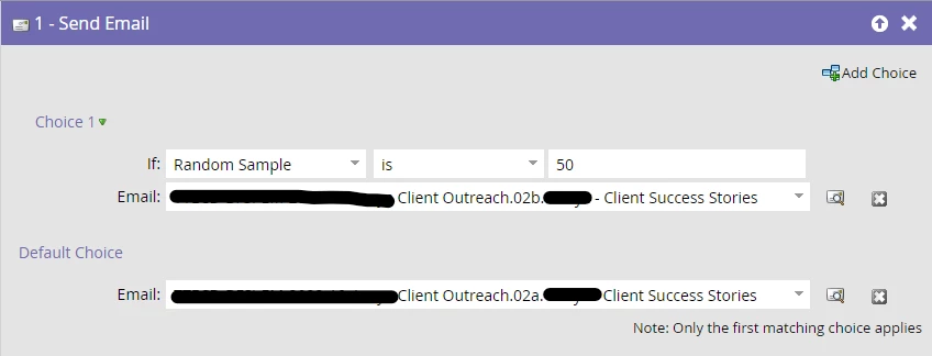 Here's how I set up the Flow Step in the campaign (I do this regularly for multi-email campaigns and have done nothing different!), and I can't figure out why only the Random Sample sent out but not the Default: