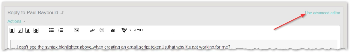 I can't see the syntax highlighter above when creating an email script token.Iis that why it's not working for me? |